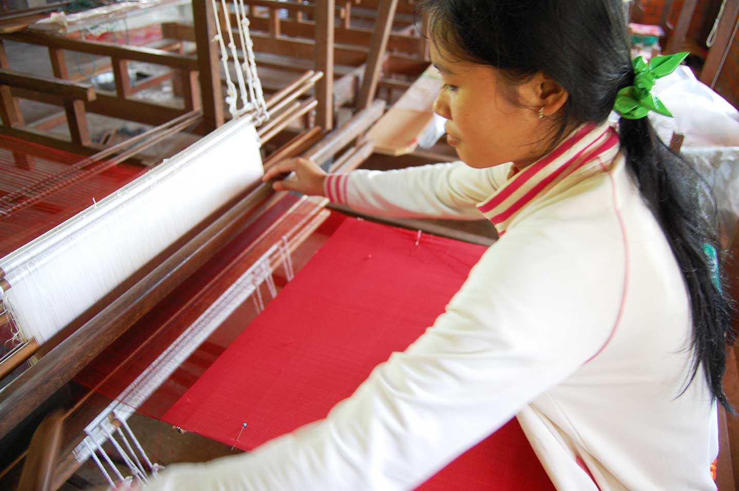 SWDCは、500名以上のカンボジアの読み書きのできない女性と、その子どもたちを支援してきたNGO。読み書きのできない女性は、例えばマニュアルを読むことができないなどのため、就労が難しい。SWDCでは、機織りのトレーニングを通じ彼女たちの雇用創出に取り組んできたという。シルクスカーフの売上は、職人の方への識字教育や、子どもたちが学校に通うために必要なお金や物品の支援、託児所の運営など労働環境の整備に使われる。