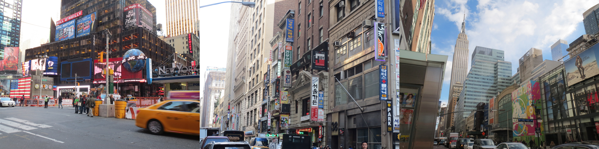 〈写真左〉タイムズスクエア周辺、〈写真中央〉コリアンタウン、〈写真右〉エンパイアステートビルディング周辺