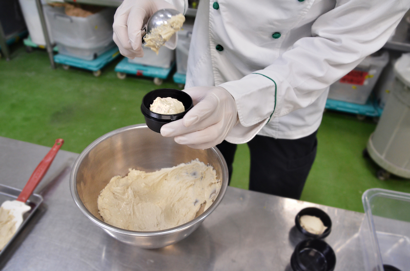 シェフたちは一日に、1種類・40キロ分の量を作るそう。今日は特別にハンドミキサーなどで見せていただいていますが、ふだんは大きな機械で一気に作っています。「機械が大きくなるだけで、工程は全くいっしょです。でも量が多いぶん、ふだんはもっと力仕事です」と、Katsuさん。