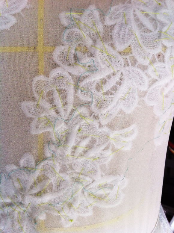 レースはあらかじめトルソーに貼り付けておいて、上からドレスを着せて上からしつけ縫い。その後、トルソーから脱がせて縫い目がみえないように手で細かくまつります。