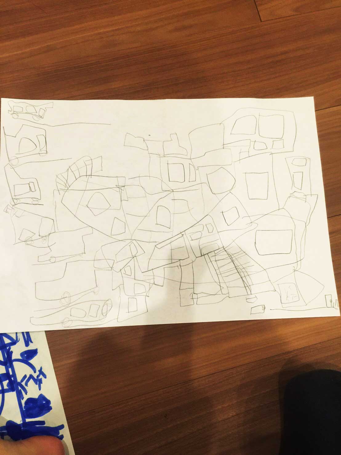 例えば、「ゾウを描いて」って言われても、鼻とか耳とか特徴的なものは描かずに、子どもと同じような感じでペンを紙の上で往復させて、グチャグチャっとしたものを描きます。